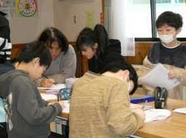 3学期は、全校生がランチルームに集まってそれぞれの学年の課題に取り組んでいます。