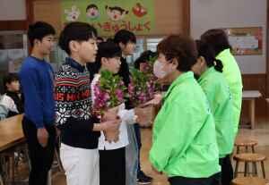 今日は、4名の方をお迎えし、代表児童の感謝の言葉に続き、お花の贈呈もさせていただきました。